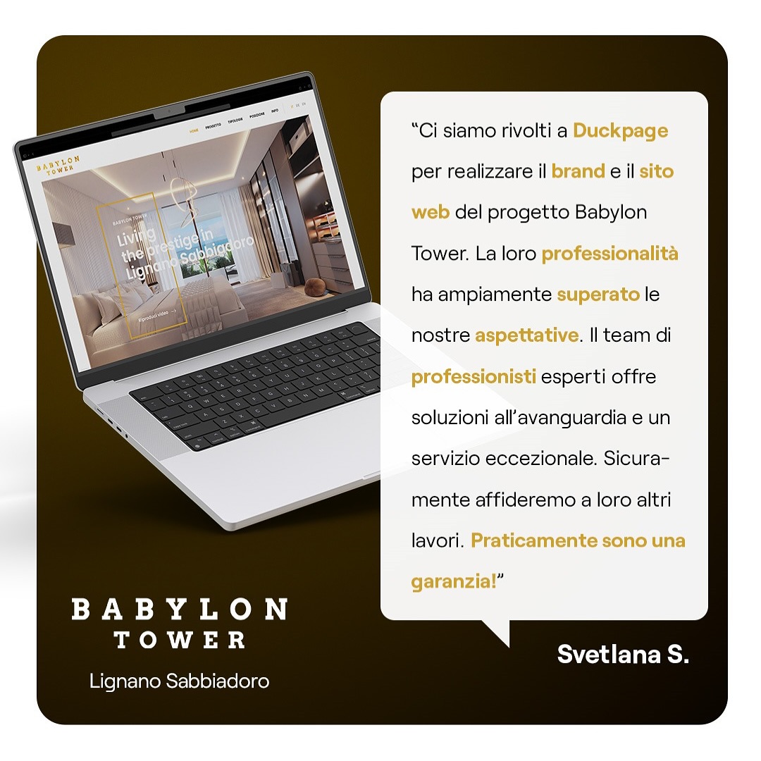 "Ci siamo rivolti a Duckpage per realizzare il brand e il sito web del progetto Babylon Tower. La loro professionalità ha ampiamente superato le nostre aspettative. Il team di professionisti esperti offre soluzioni all’avanguardia e un servizio eccezionale. Sicuramente affideremo a loro altri lavori. Praticamente sono una garanzia!”